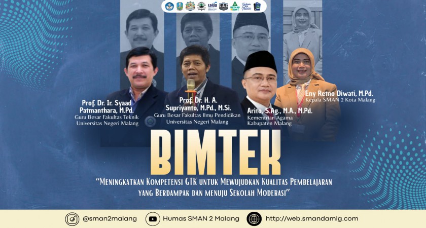 Malang (23/04/2026) – Sebanyak 82 peserta yang terdiri dari Kepala Sekolah, tenaga pendidik, dan tenaga kependidikan SMAN 2 Kota Malang mengikuti Bimbingan Teknis (Bimtek) Peningkatan Kompetensi GTK dengan tema "Meningkatkan Kompetensi GTK untuk Mewujudkan Kualitas Pembelajaran yang Berdampak dan Menuju Sekolah Moderasi" yang dimulai pada Kamis (23/4) di Aula Sabhayatama Grha.